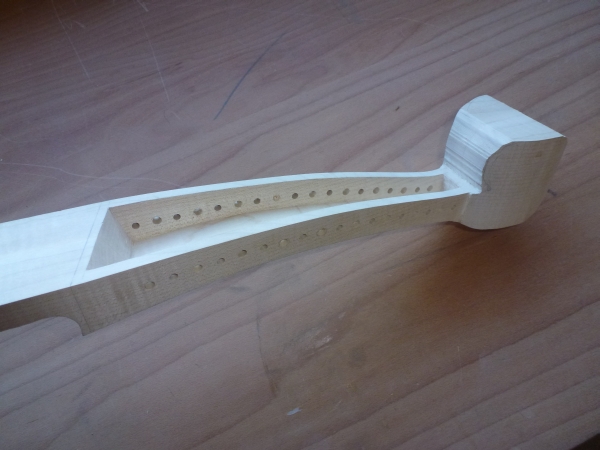 mit Griffbrett und festen Metallbünden. Gehöhltes Griffbrett zwischen den Bünden